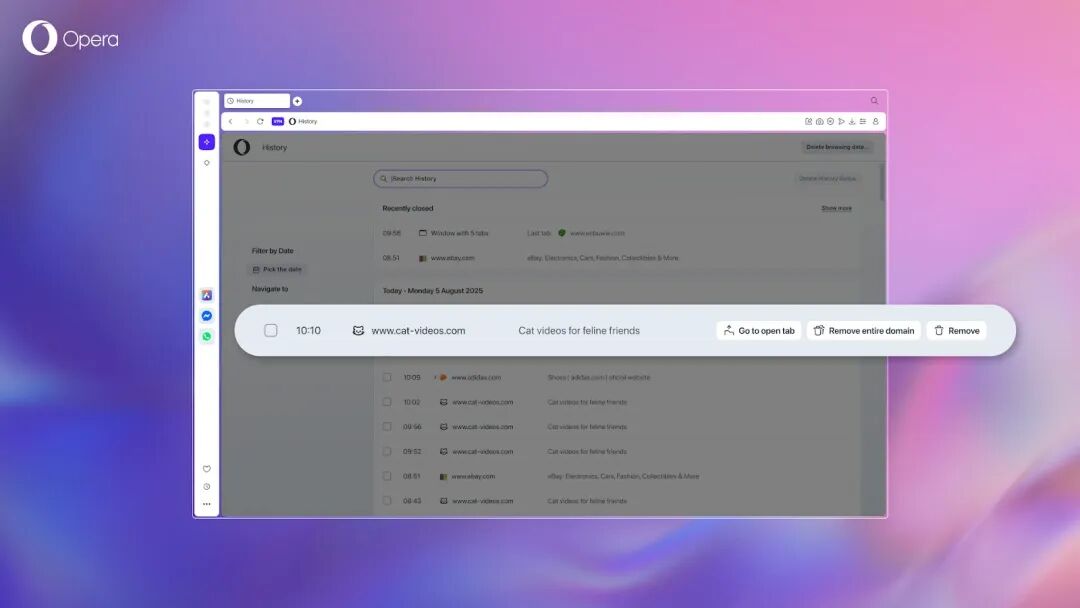 Opera在“历史记录”功能中实现的另一个酷炫功能是删除整个域名。要执行此操作,用户只需在浏览器历史记录中将鼠标悬停在任意网页上,然后点击“删除整个域名”。选择从历史记录中删除哪个域名完全由用户决定。